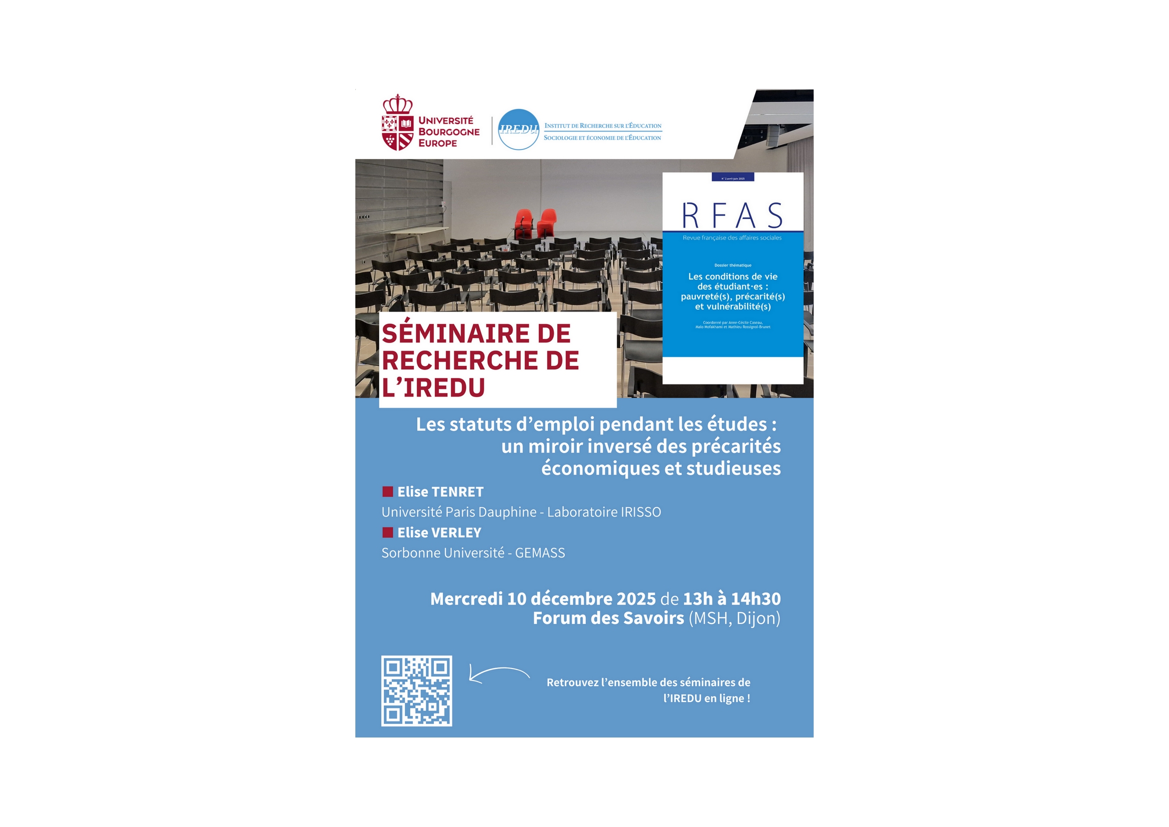 Séminaires à venir Séminaire de l’IREDU animé par Élise Verley et Élise Tenret « Les statuts d’emploi pendant les études : un miroir inversé des précarités économiques et studieuses »
