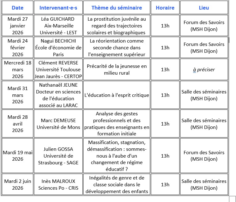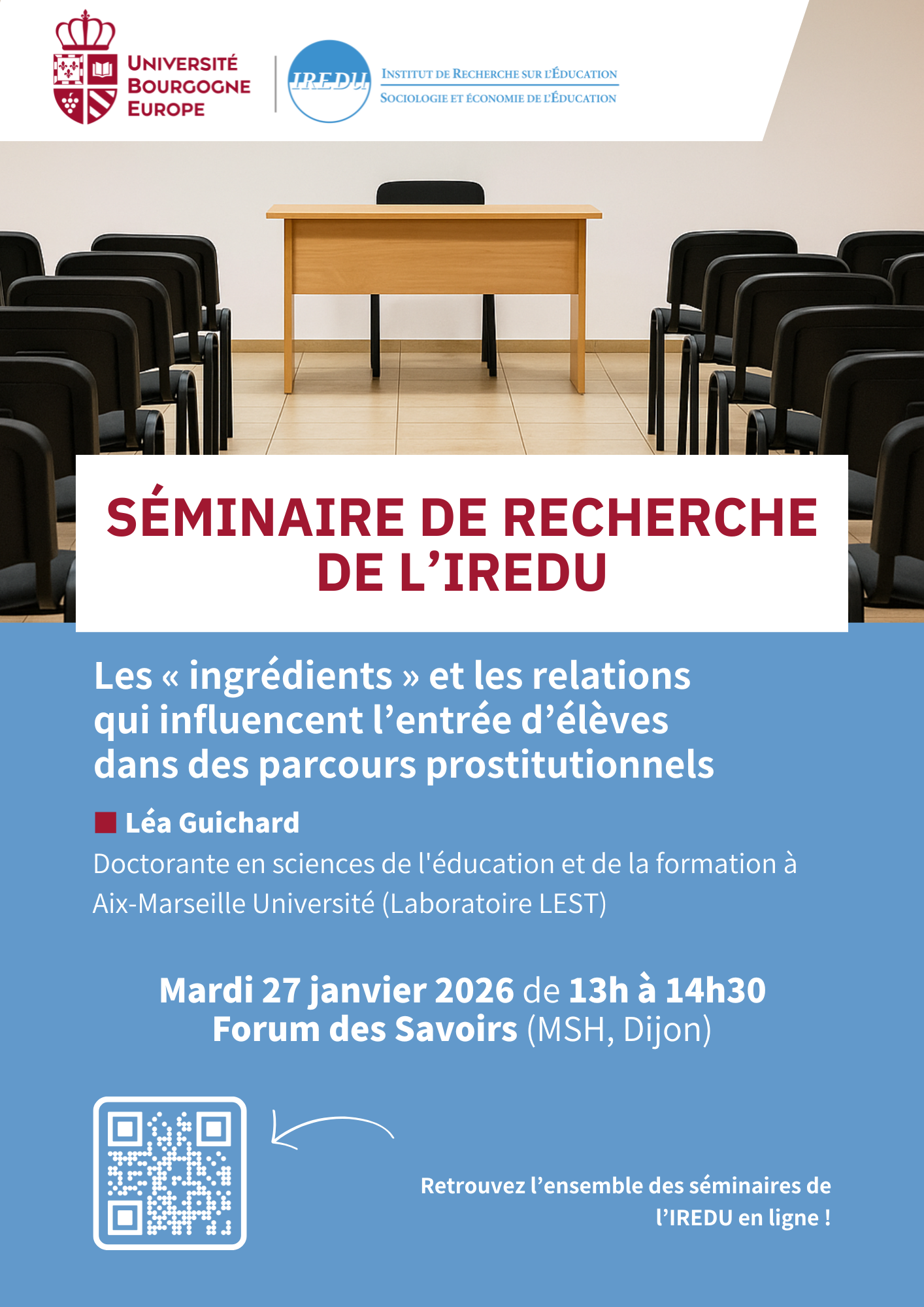 Actualités Séminaire de l’IREDU le mardi 27 janvier 2026 : « Les « ingrédients » et les relations qui influencent l’entrée d’élèves dans des parcours prostitutionnels »