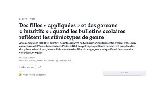 Actualités Nouvel article dans le Monde à propos de l’étude « A niveau égal, appréciation égale ? Comment les appréciations scolaires varient en fonction du sexe des élèves », de Pauline Charousset et Marion Monnet